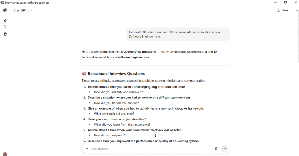 “Generate 10 behavioural and 10 technical interview questions for a [Software Engineer / Marketing Analyst / HR Executive] role.”